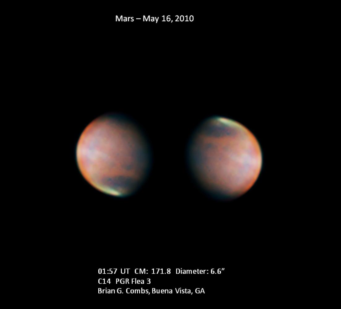 Brian, An excellent image of Mars at a small angular diameter (6.6"). You have captured Mare Sirenum towards the southern limb and the Propontis Complex/Scandia to the north. The new camera picked up the clouds over Tharsis very nicely. Thank you for sharing it with us all. Regards, Carlos E. Hernandez